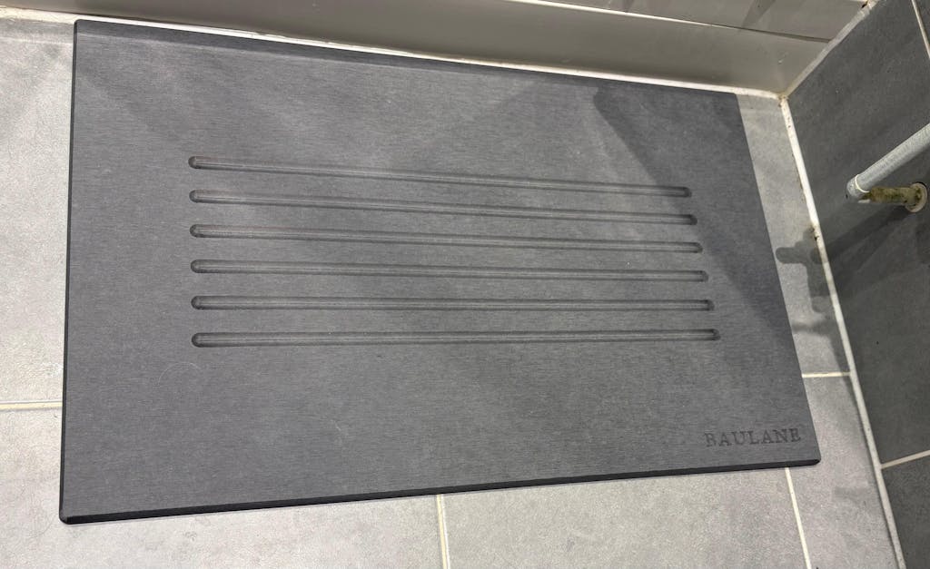Diatomite bath stones dry quickly and are a lot less hassle than classic bath mats or towels. I’m surprised not more people know about them. The Baulane models have a great look to them and fit nicely in the bathroom.
